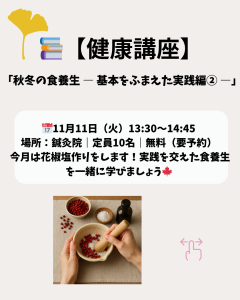 - 内容:秋冬の食材選び/温める・潤すのバランス/花椒塩作り