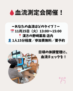 野崎薬局では、日々の養生を後押しする特典とイベントをご用意しました。カレンダーは画像で添付しますので、営業日や担当はそちらもご確認ください。